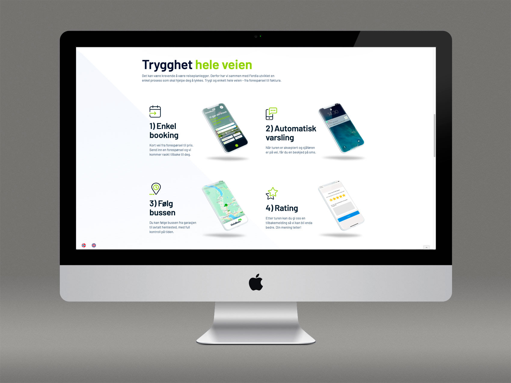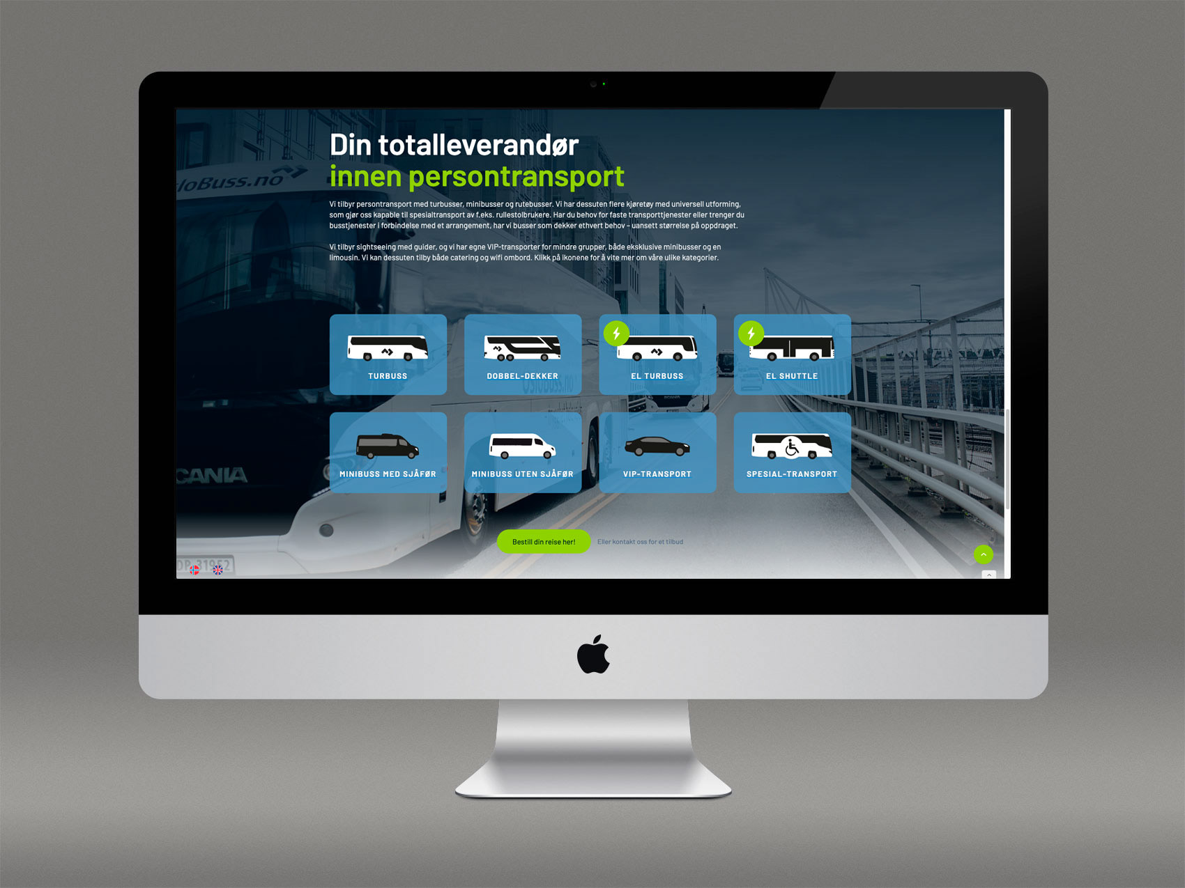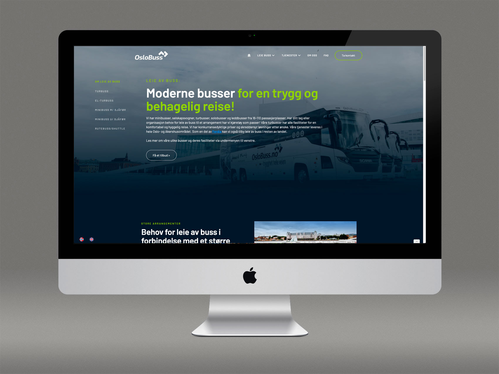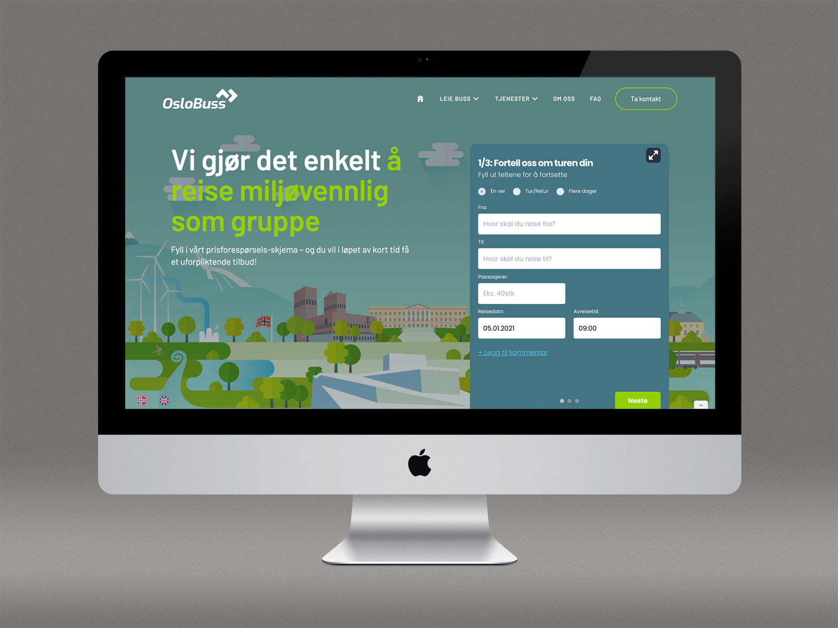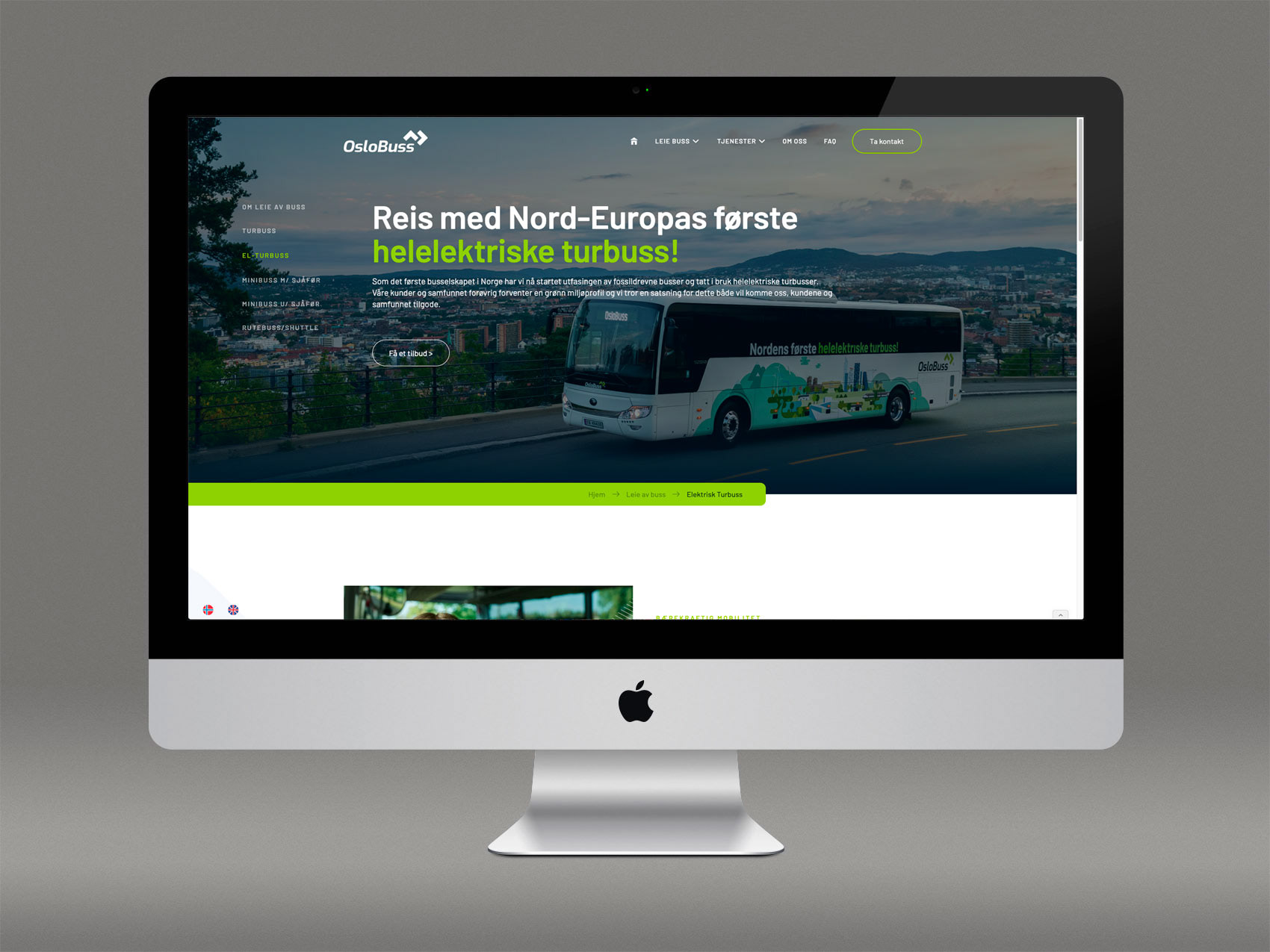 Nye nettsider og oppdatert profil for OsloBuss. Siden er bygget i verktøyet Webflow. Prisforespørselsskjemaet er en tjeneste levert av Ferdia, der OsloBuss er medeiere. Språk håndteres med Weglot.